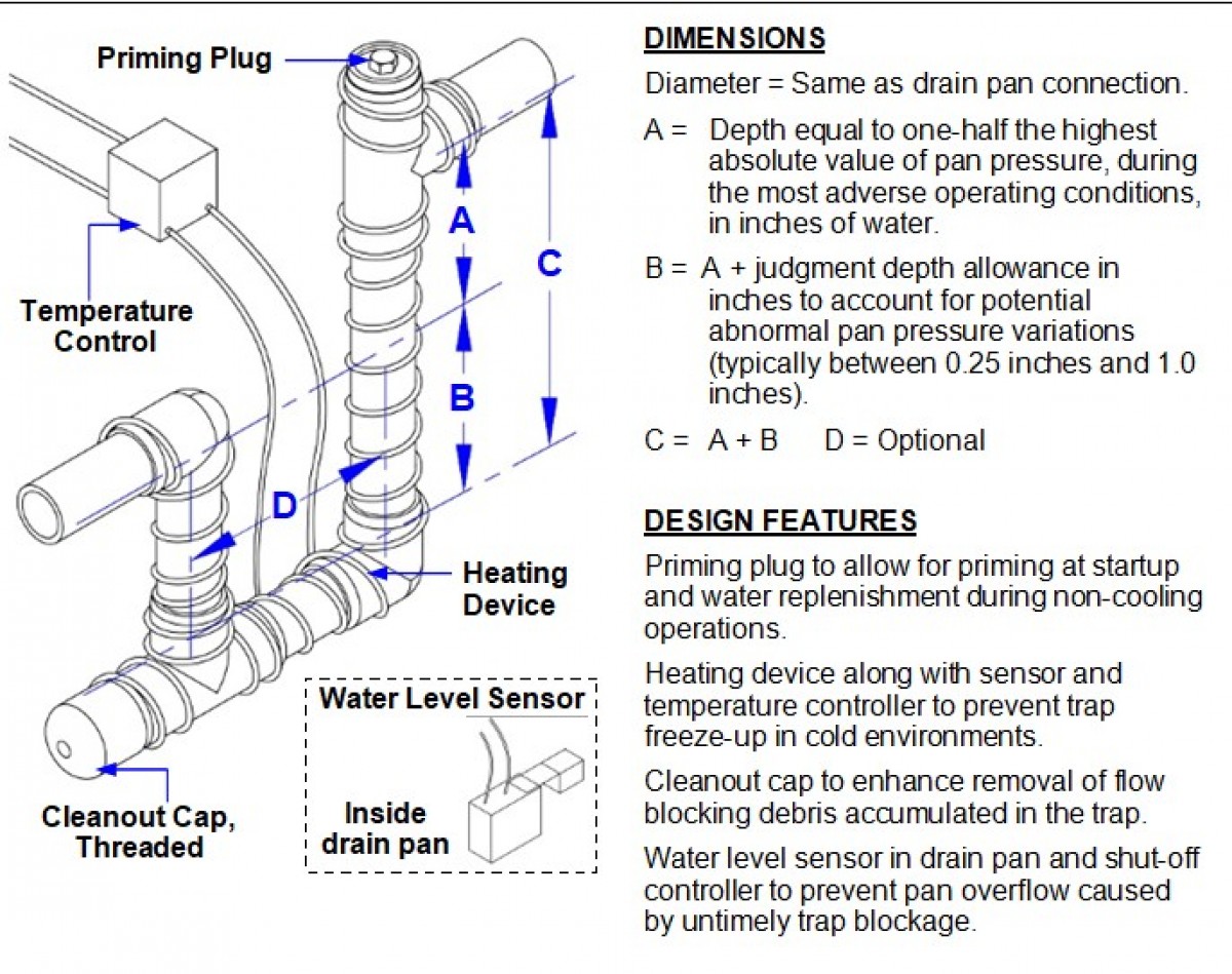 The drain system design features necessary for acceptable condensate trap performance include: geometry dimensions that match the drain pan pressure; provisions for priming and debris cleanout; means for preventing drain pan overflow (to protect against untimely flow blockage); and a method for preventing trap freeze-up in sub-freezing environments. Designs that illustrate these features are shown in Figures 7 and 8, for draw-through and blow-through air handlers, respectively.